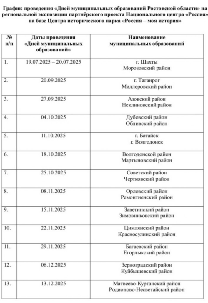 Президент России поддержал инициативу создания в каждом регионе экспозиций – наследников выставки «Россия». Проект объединяет культурное наследие страны и достижения регионов. В Ростовской области 25.01.2025 на базе парка «Россия – моя история» была запущена региональная экспозиция, полное название – региональная экспозиция партнёрского проекта национального центра «Россия». На экспозиции представлены 13 тематических площадок: от агропромышленности и цифровых технологий до туризма и волонтёрства.
