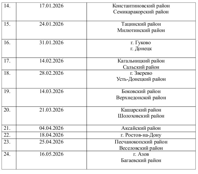 В рамках знакомства с регионом запланированы как тематические дни (день Победы, день промышленности и культуры и т.д.), так и дни муниципальных образований Ростовской области, когда своими достижениями делятся муниципалитеты региона – от приглашения предприятий до знакомства с волонтёрскими проектами региона.